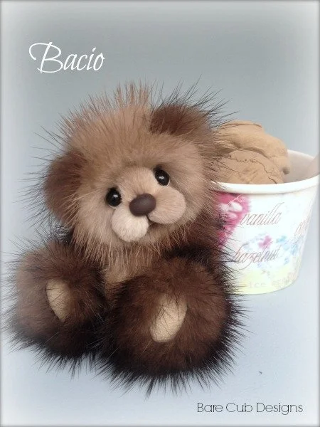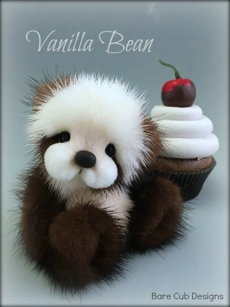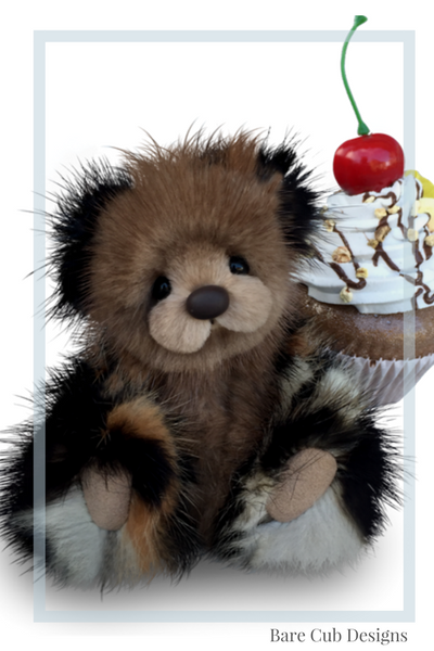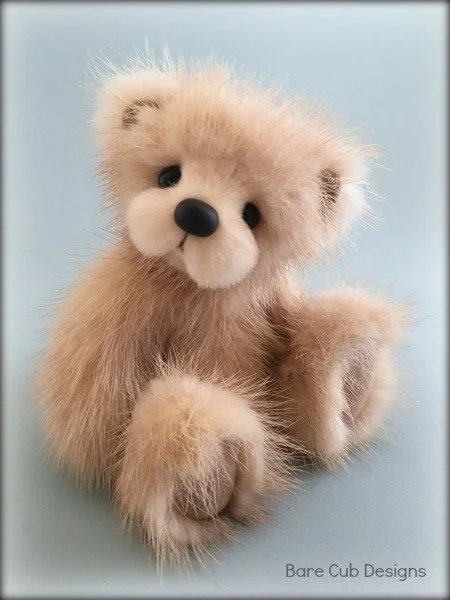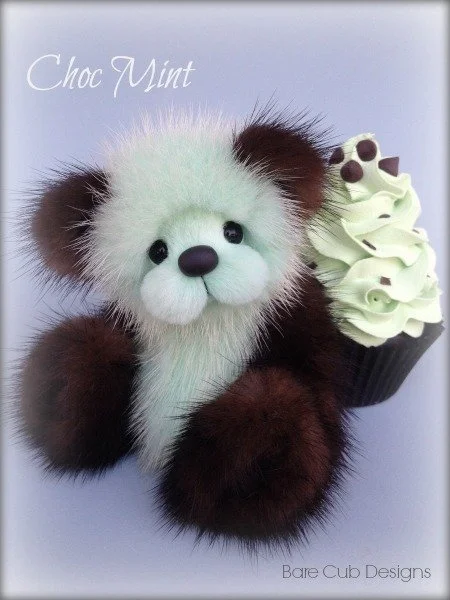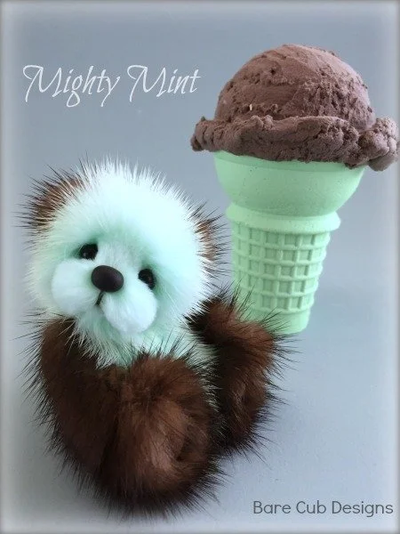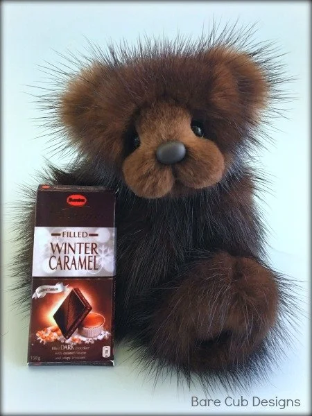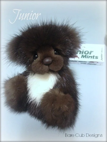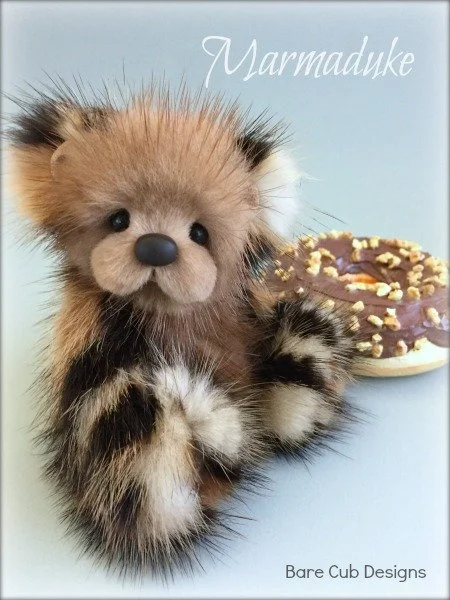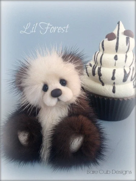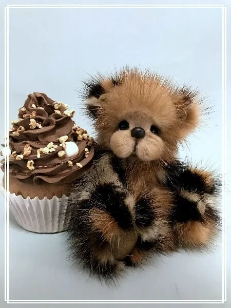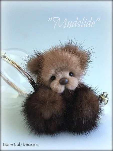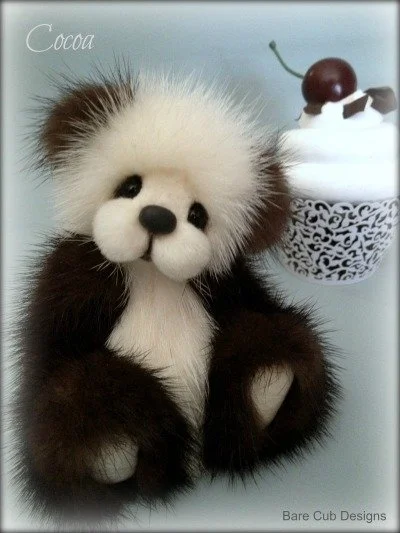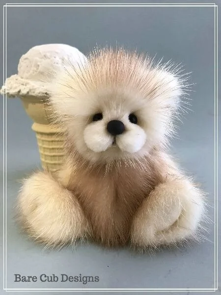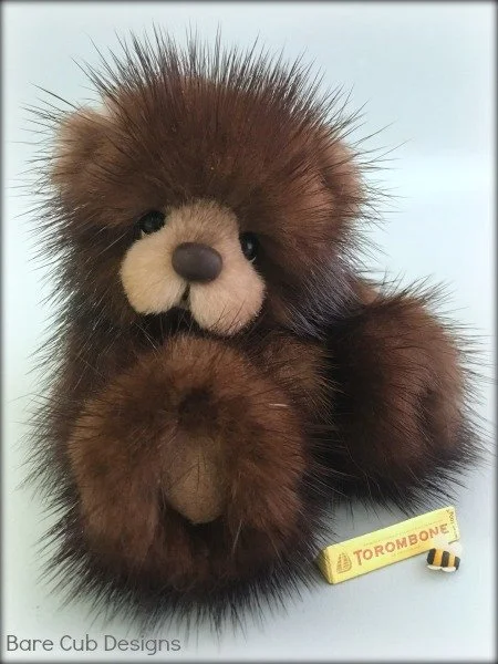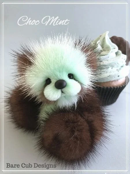 A slightly larger Bare Cub Design, at 5 inches tall and just 4 inches when sitting. This cub is made from a unique hand dyed spotted mink with matching cocoa brown and has matching suede paw pads.