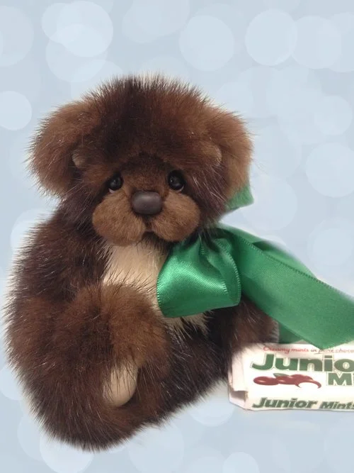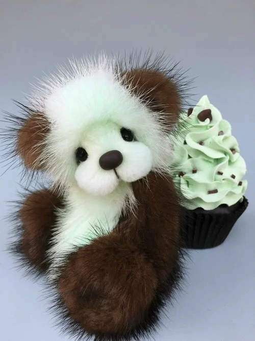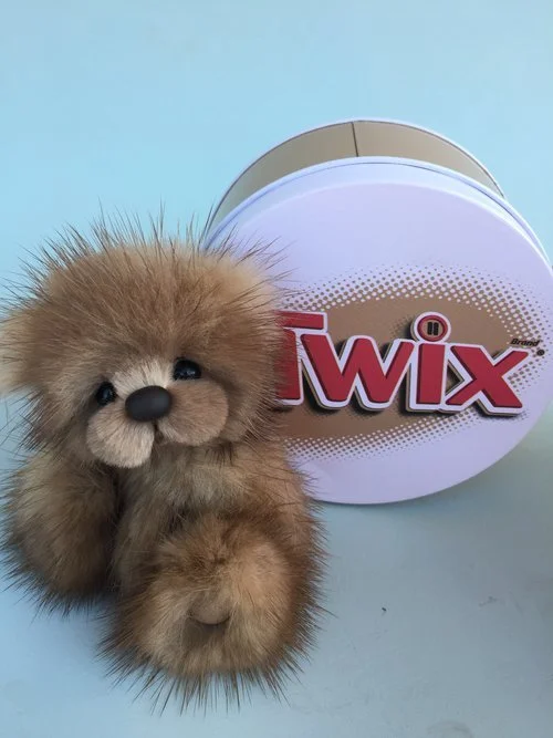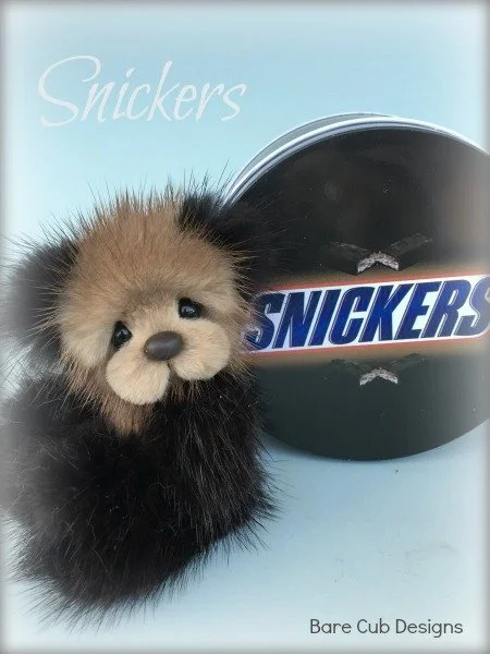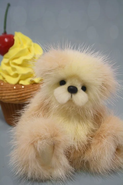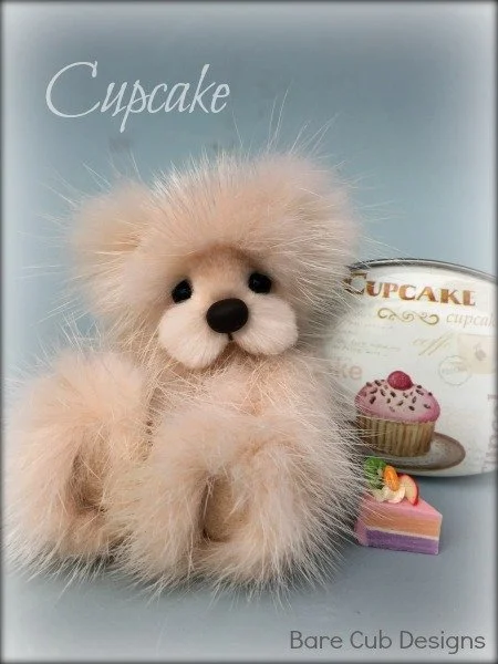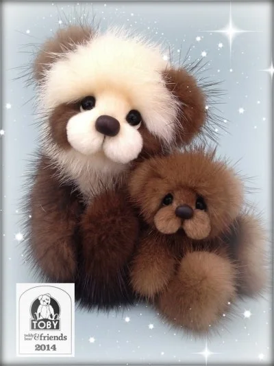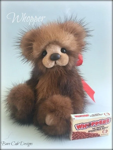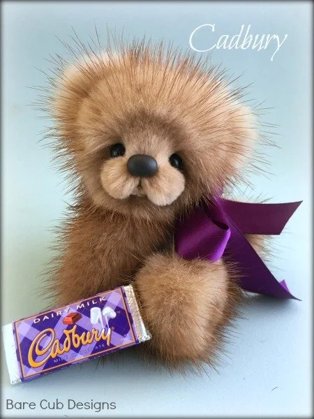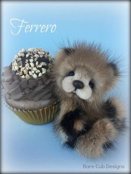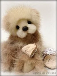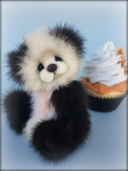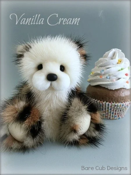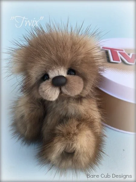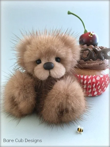 A slightly larger Bare Cub Design, at 5 inches tall and just 4 inches when sitting. This cub is made from a unique hand dyed spotted mink with matching cocoa brown and has matching suede paw pads.