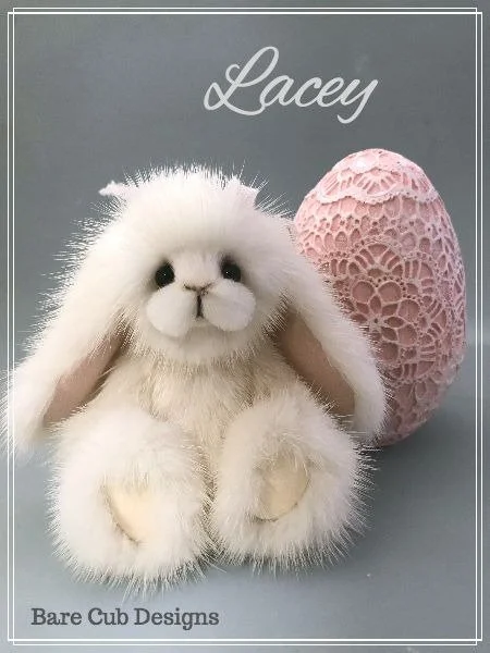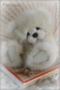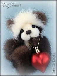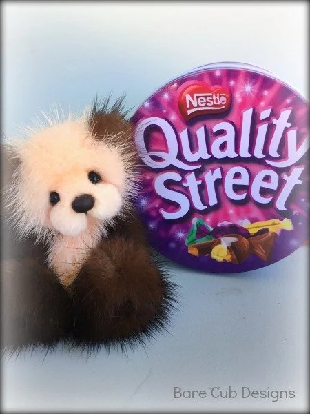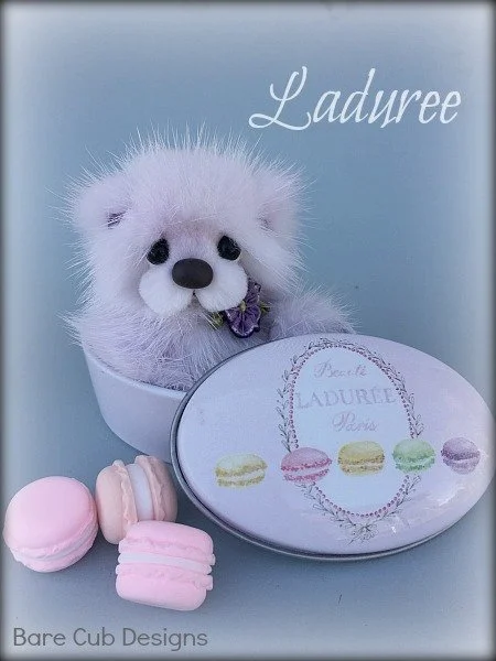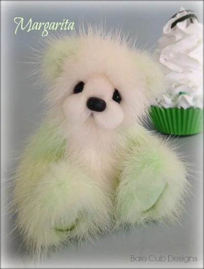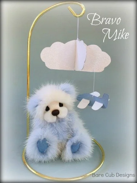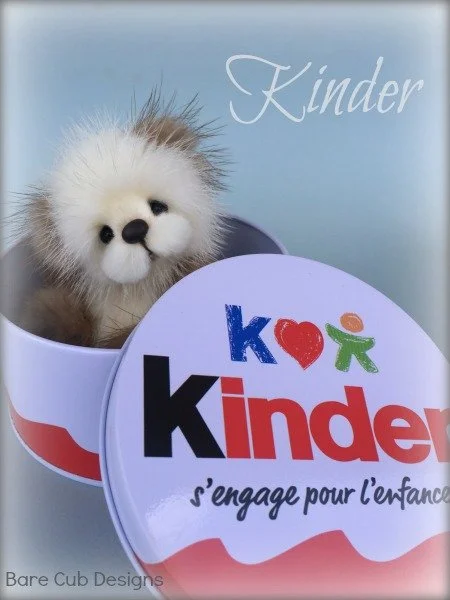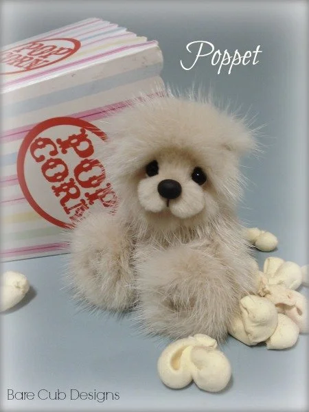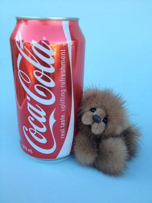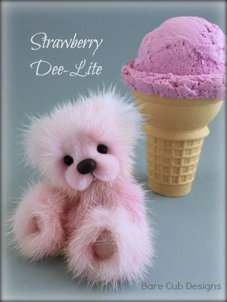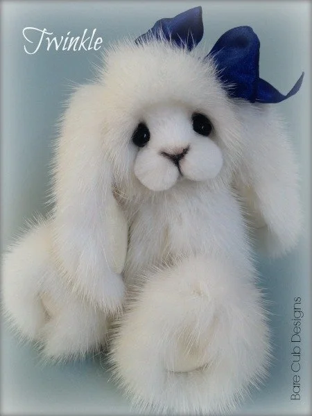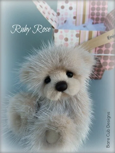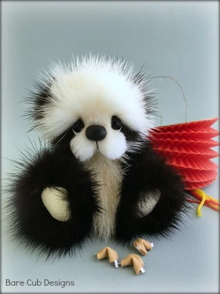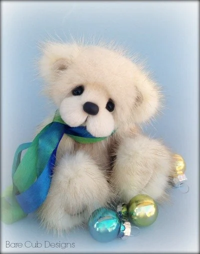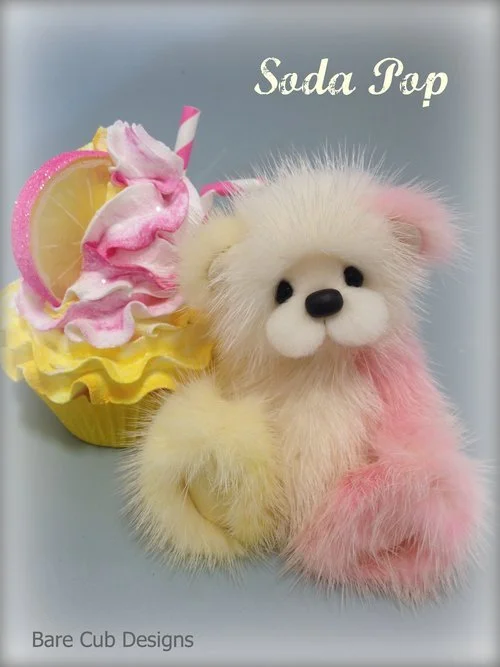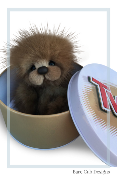 A slightly larger Bare Cub Design, at 5 inches tall and just 4 inches when sitting. This cub is made from a unique hand dyed spotted mink with matching cocoa brown and has matching suede paw pads.